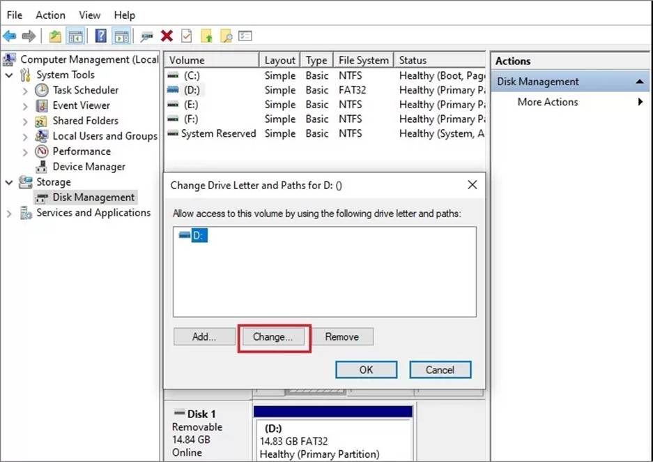 - Right-click on the drive and select Change Drive Letter and Paths.